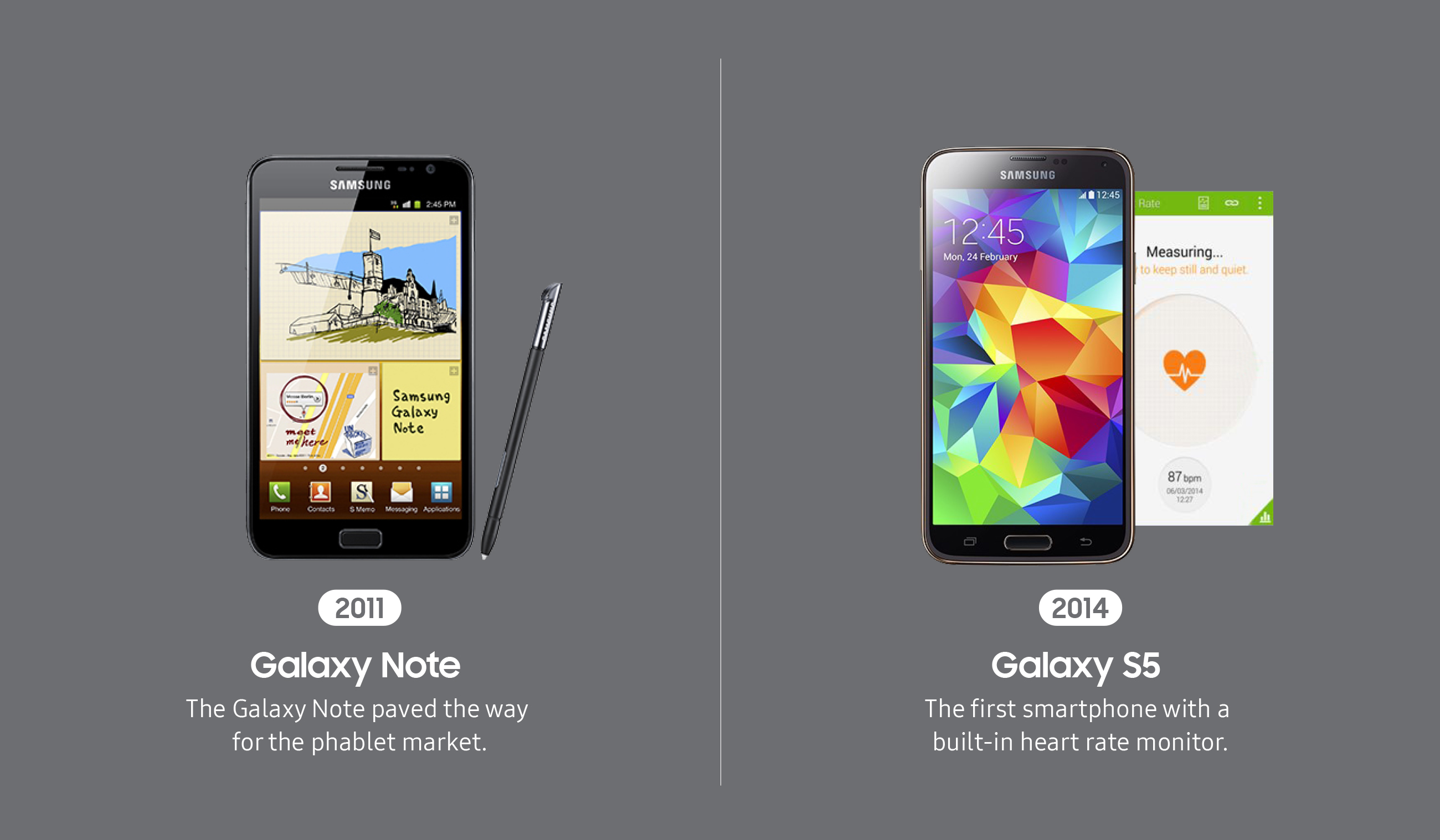In 2011, the Galaxy Note established an entirely new mobile category -- the large screen smartphone and debuted the S Pen. With increased screen real estate, users could watch, multitask and create more. The Note debuted the iconic S Pen, delivering new ways to interact with the smartphone.