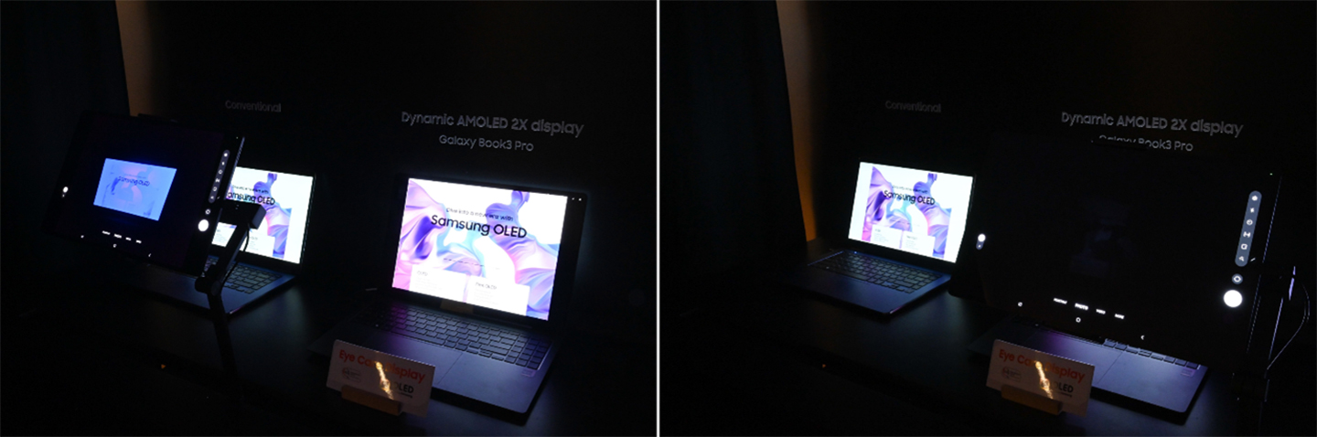 The Galaxy Book 3 Pro received the “Eye Care Display” blue light reduction certification. The old model, seen on the left, emits harmful blue light, as shown on the tablet. On the right, the tablet appears black because blue light is not emitted.