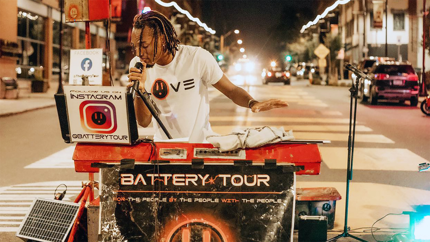AY performing a street concert in Kansas City powered by portable solar batteries.