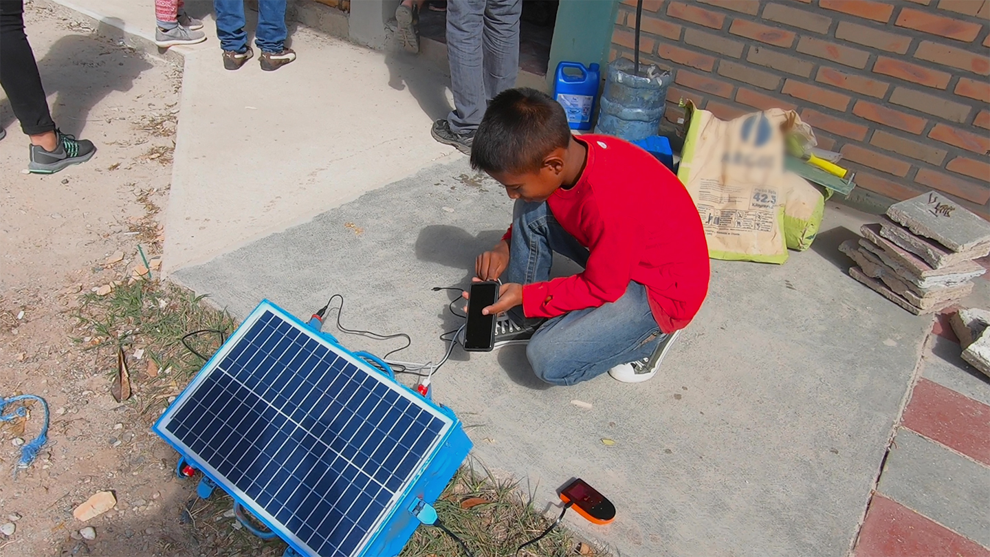 A child in Tegucigalpa, Honduras, uses a portable solar battery donated by AY to charge his cellphone.