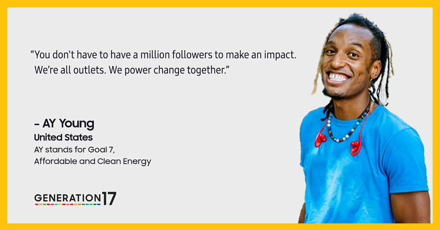 AY Young is a member of Generation17, a partnership between Samsung and the United Nations Development Programme (UNDP), empowering young people around the world who are contributing to the Global Goals.