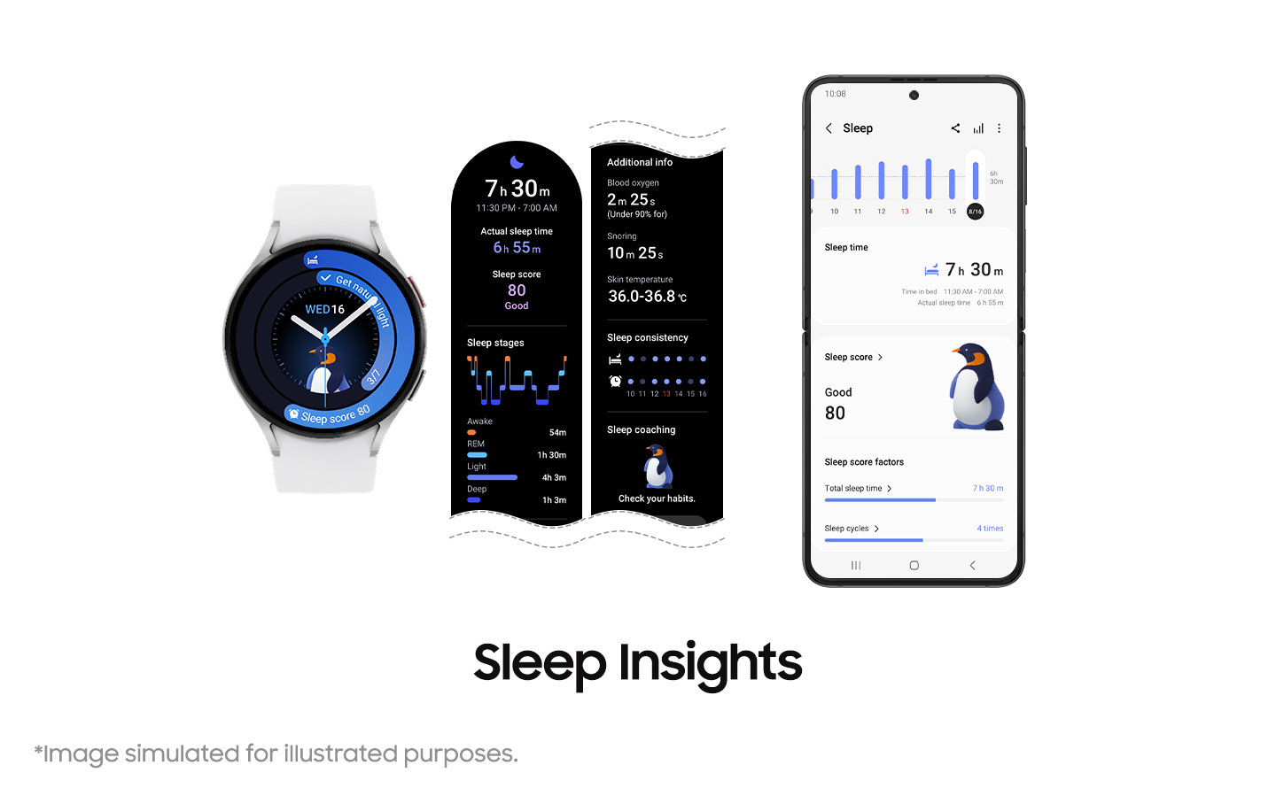 Furthermore, maintaining a sleep-friendly environment is important for a restful night of sleep. When it’s time for bed, your Galaxy Watch can help set the optimal sleep environment by automatically adjusting the settings of connected home devices11. In addition, when Sleep Mode is turned on, the invisible LED infrared sensor on the watch activates to minimize even the smallest of distractions.