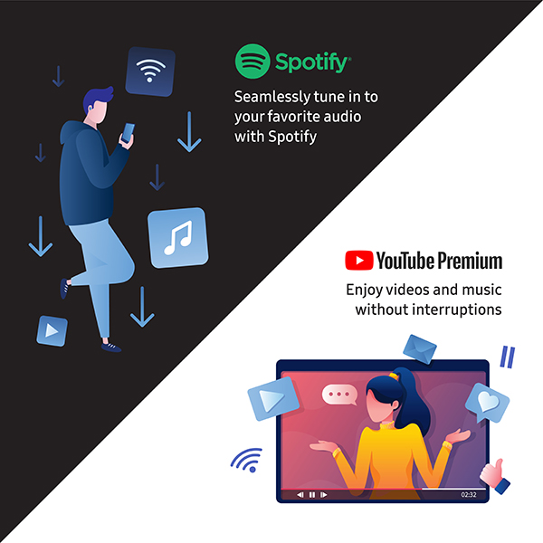 When you need a break, discover a suite of entertainment services right on your Galaxy device. Samsung’s partnership with YouTube allows Galaxy S20 users to enjoy YouTube videos and music without ads and even when you’re offline. Get up to four months free of YouTube Premium4 and also play content with your screen off or while using another app.