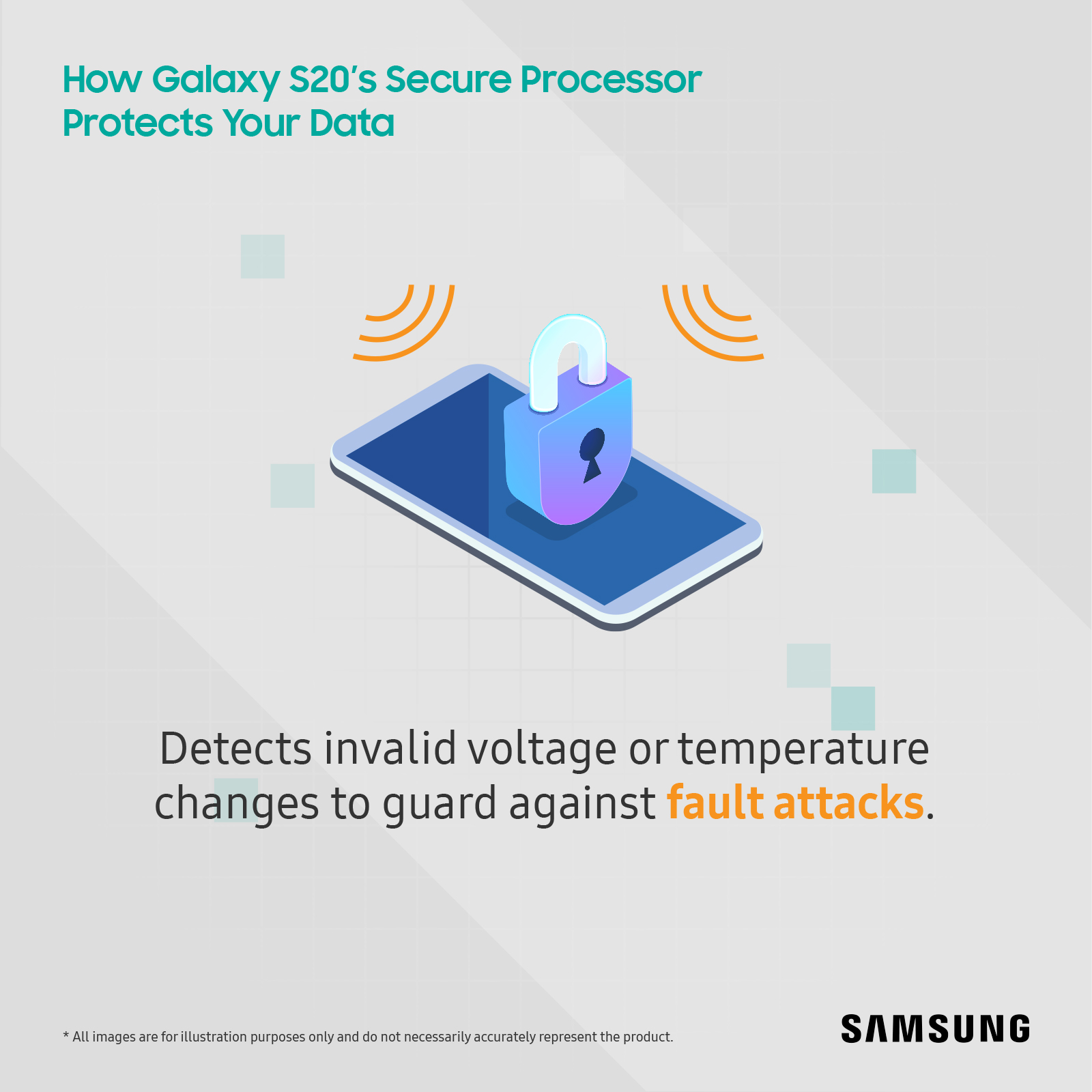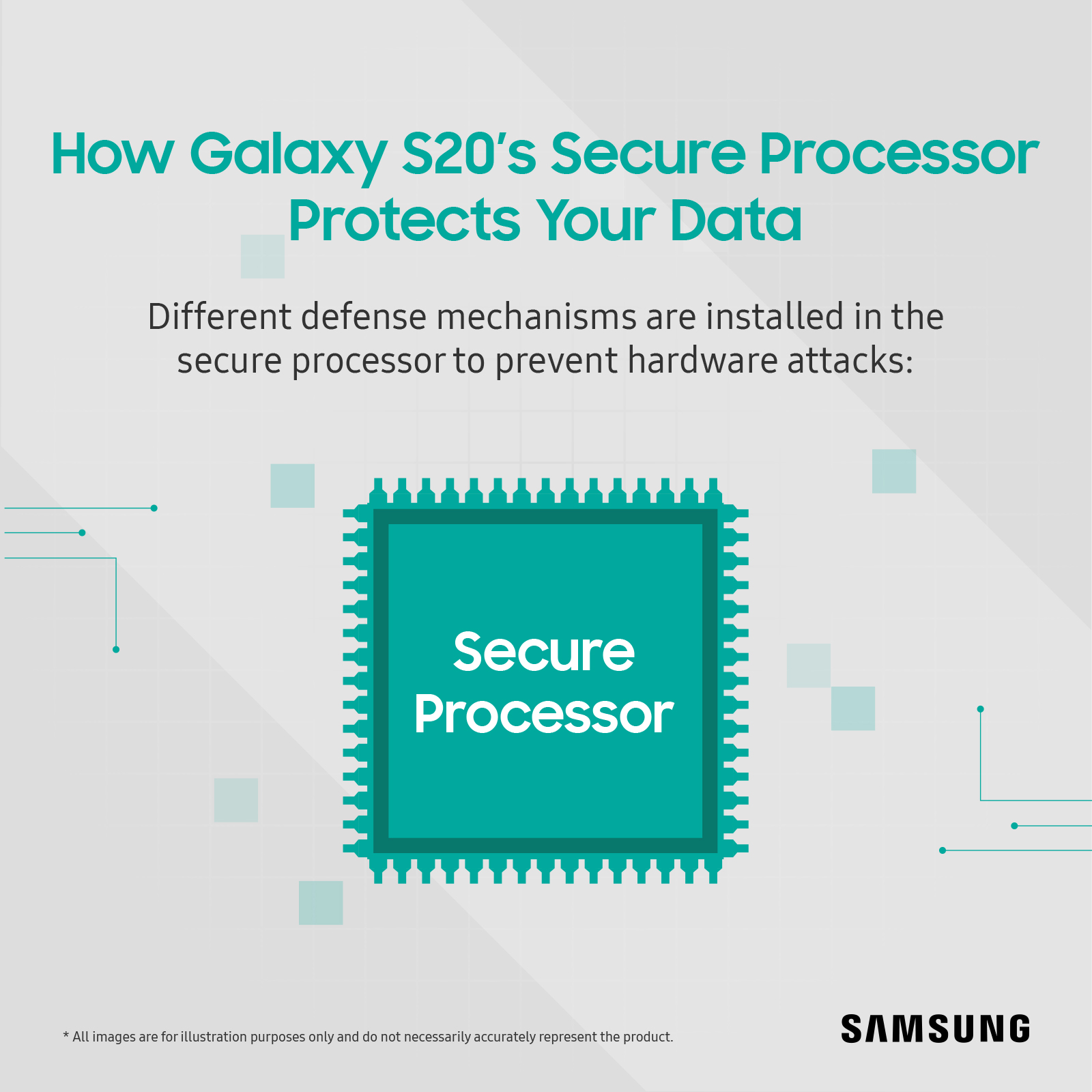 For the Galaxy S20, we continued to build on this solid security foundation. At the heart of the enhanced system is the secure processor, which is engineered to ensure your data is protected even against advanced hardware attacks.