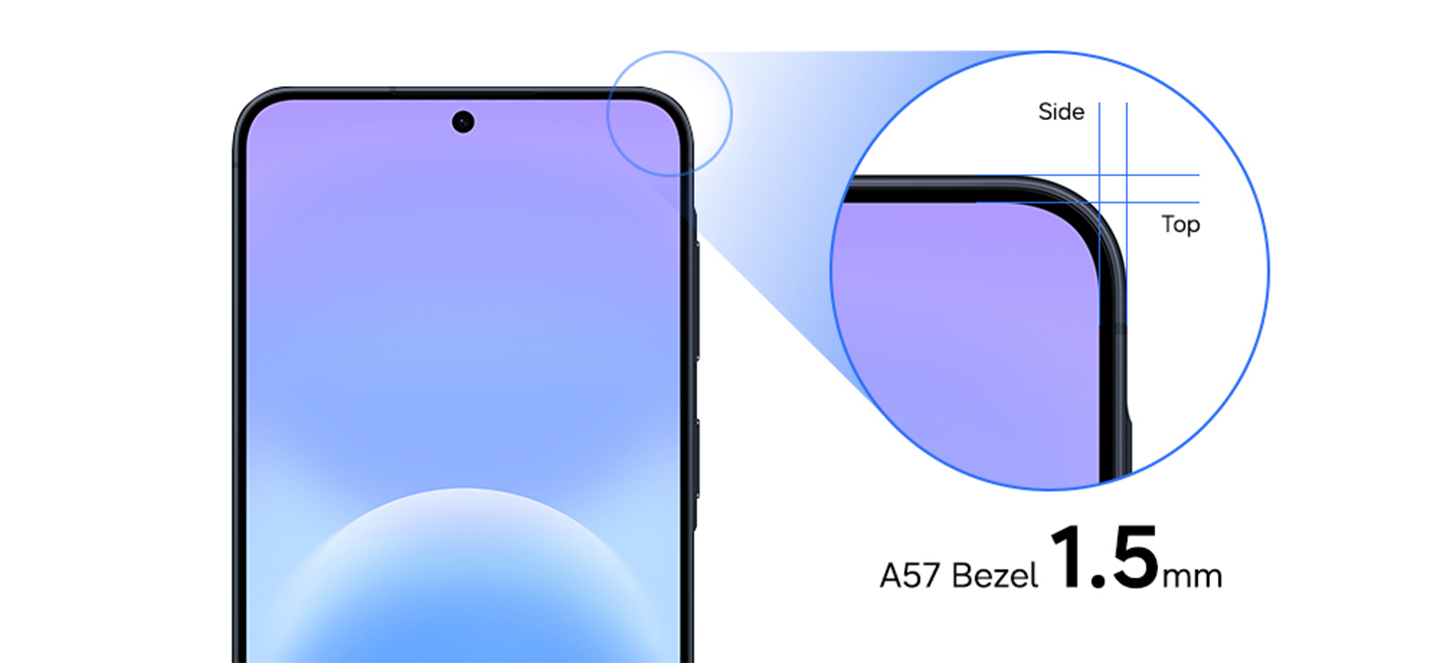 Display improvements further elevate the experience. Galaxy A57 5G features 1.5 mm bezels on the top and sides — reduced by 0.7 mm at the top and 0.5 mm on the sides — for a more immersive viewing experience without increasing device size.