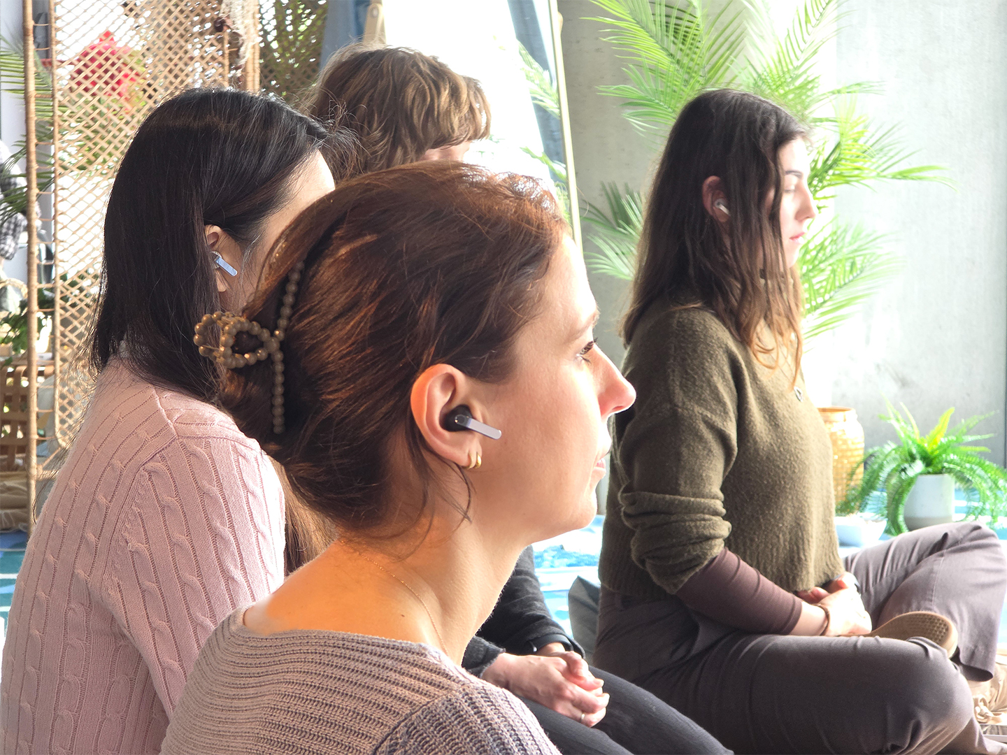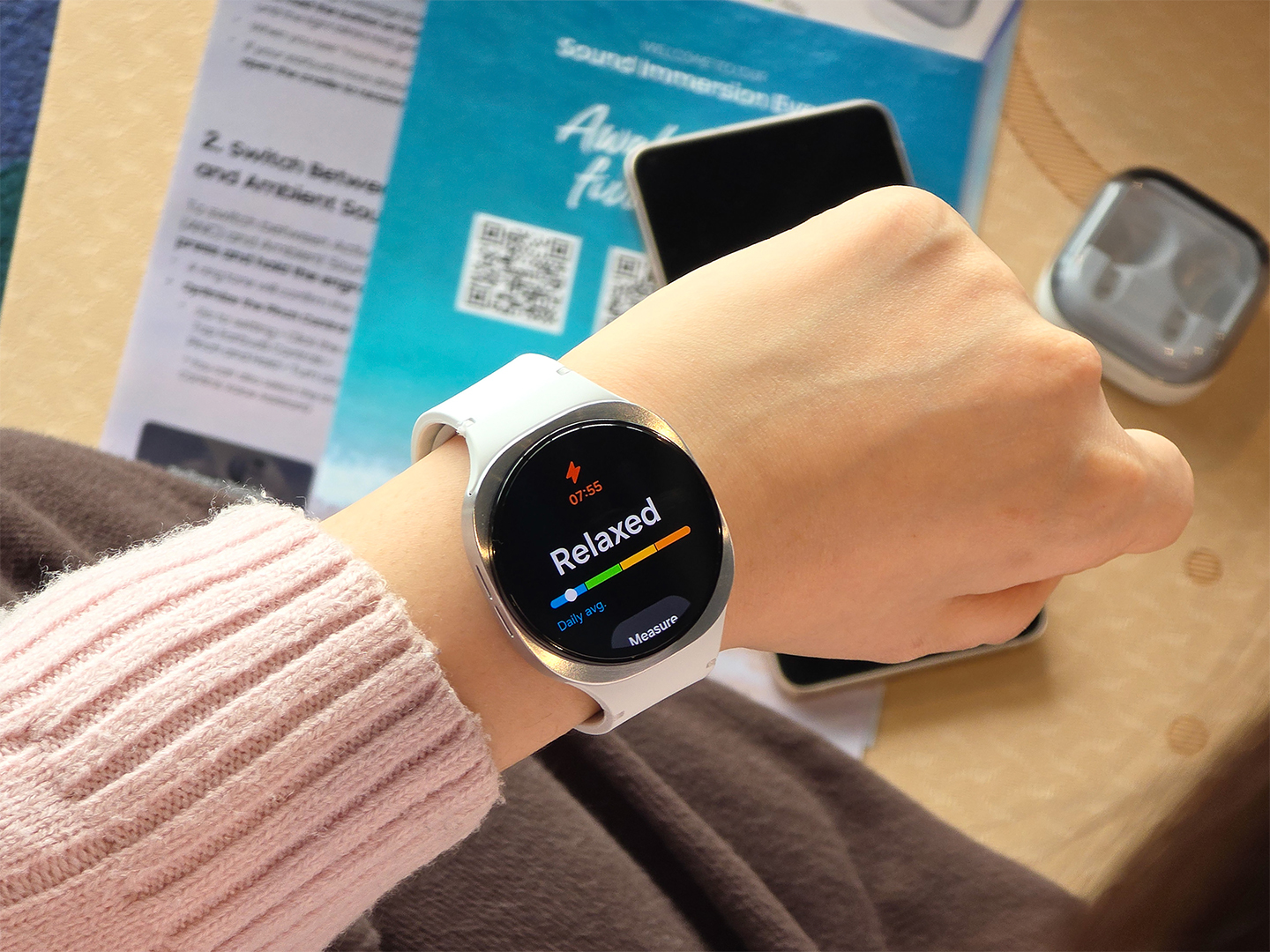 Participants wear Galaxy Buds4 Pro and Galaxy Watch8 while listening to meditation music.