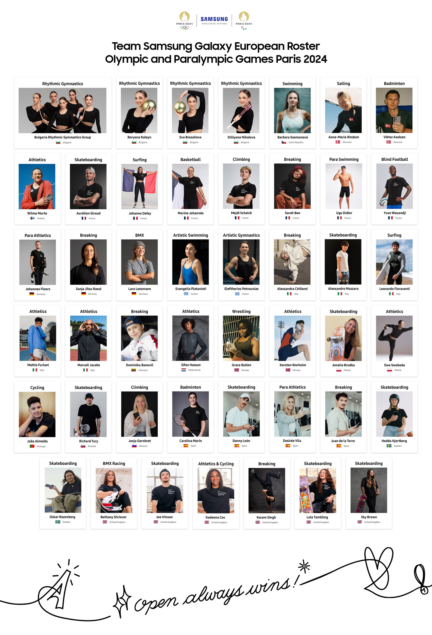 European Team Samsung Galaxy for Paris 2024 (Listed in alphabetical order by country, then name):